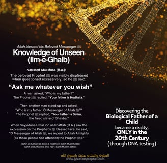 “The Munafiqs (hypocrites) made an objection to the knowledge of the Prophet (peace be upon him). The Prophet (peace be upon him) stood on the pulpit and said, “Ask me what you will”. One person stood up and asked, “What will be my place in the Hereafter?” The Prophet replied, “Hell”. Another person whose name was Abdullah bin Huzaifa, (people doubted whether he was a legitimate child), stood up and asked, “Who is my Father?” The Prophet (peace be upon him) replied, “Your Father is Huzaifa”. (Thus the accusation on Abdullah bin Huzaifa was cleared.) The Prophet (peace be upon him) repeated, “Ask me, ask me”. (Bukhari Kitab-ul-I’tisaam Muslim chap on Fadial]